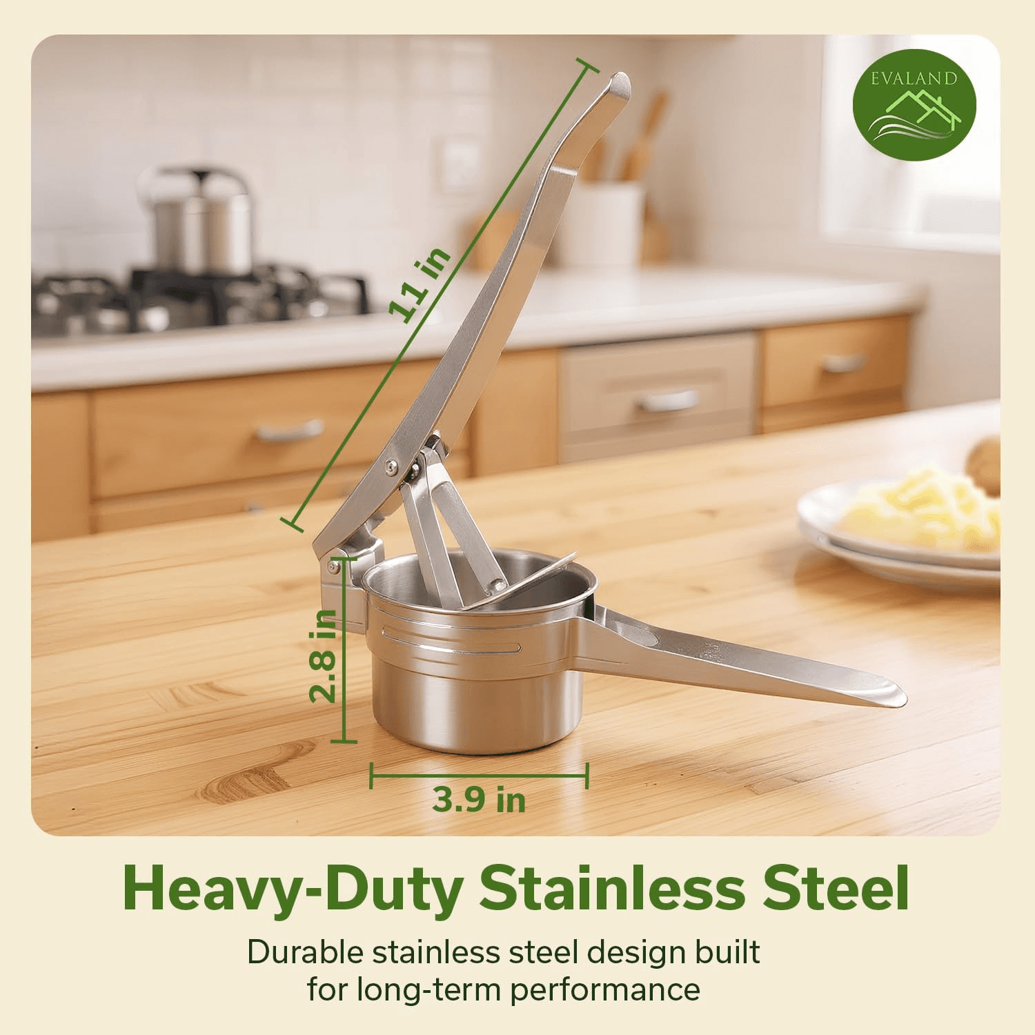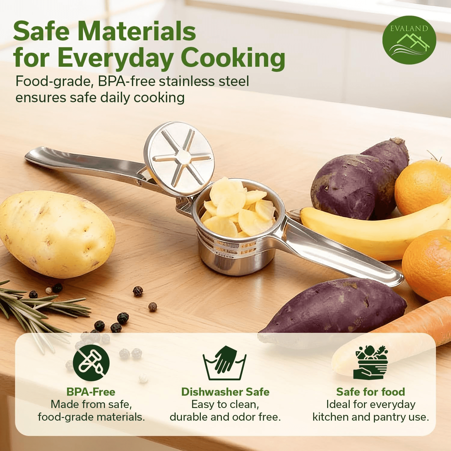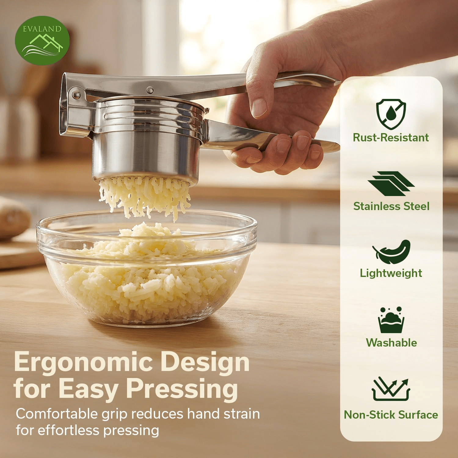 Achieve smooth, fluffy mashed potatoes with minimal effort. The EVALAND Potato Ricer is designed to press cooked potatoes evenly, creating a light texture without overworking or turning them gummy.