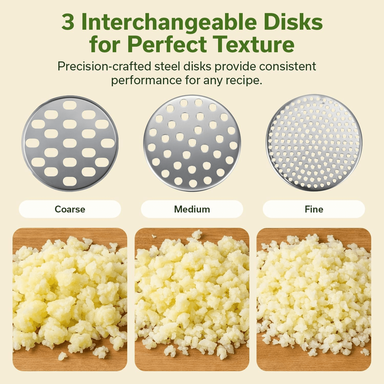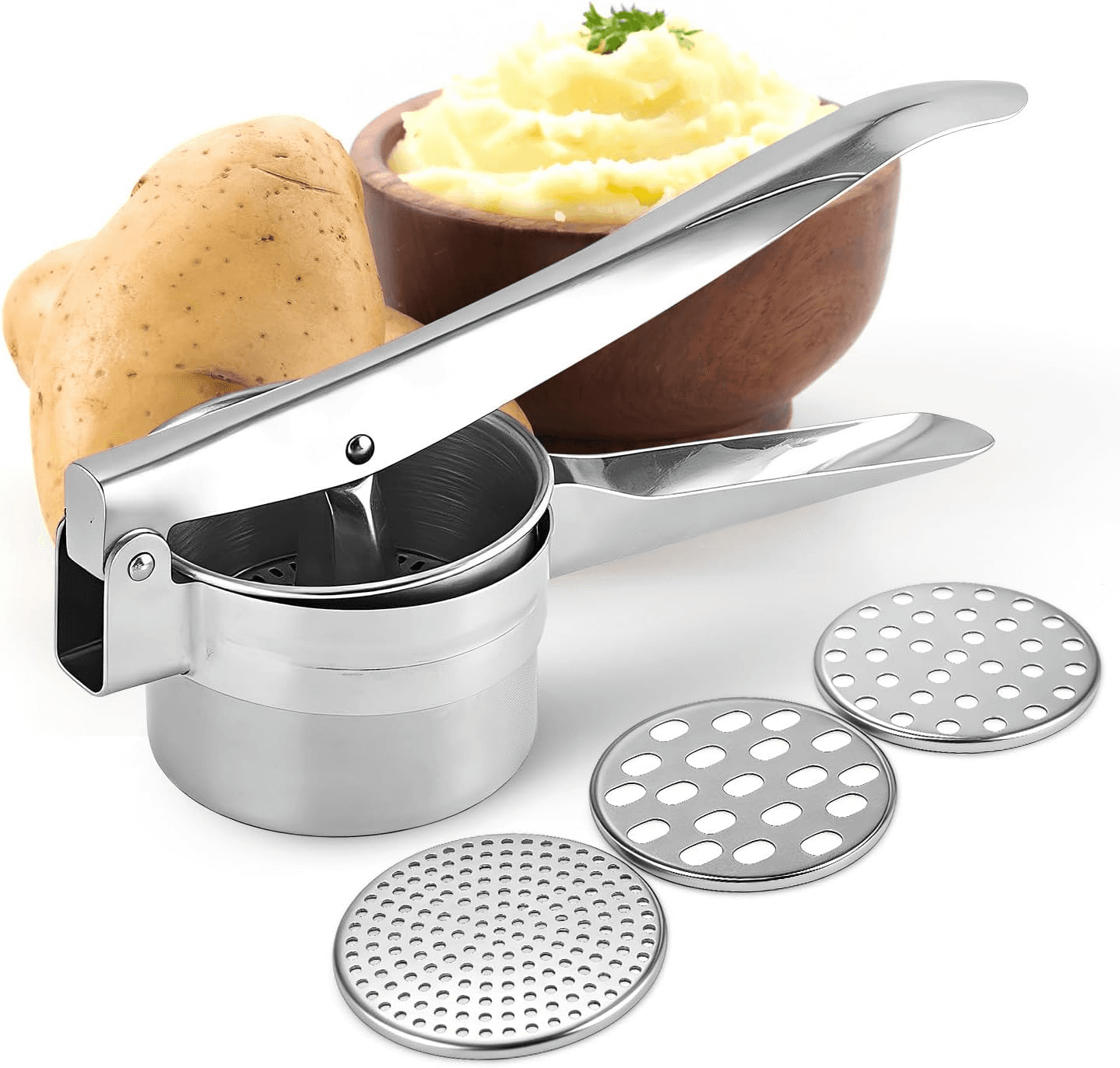 Built with durable materials and a comfortable handle, it offers steady control and easy pressing for everyday cooking. Interchangeable plates allow you to adjust texture for potatoes, vegetables, and other soft foods, making it a versatile tool for any kitchen.